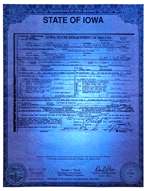Idlord Fake Iowa Birth Certificate